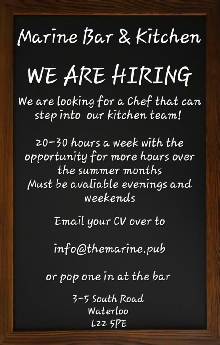 We are looking for someone with experience in pub kitchens, must be available evenings and weekends. Email your CV over to: Info@themarine.pub Or drop your CV in at the bar. Must be over 18.