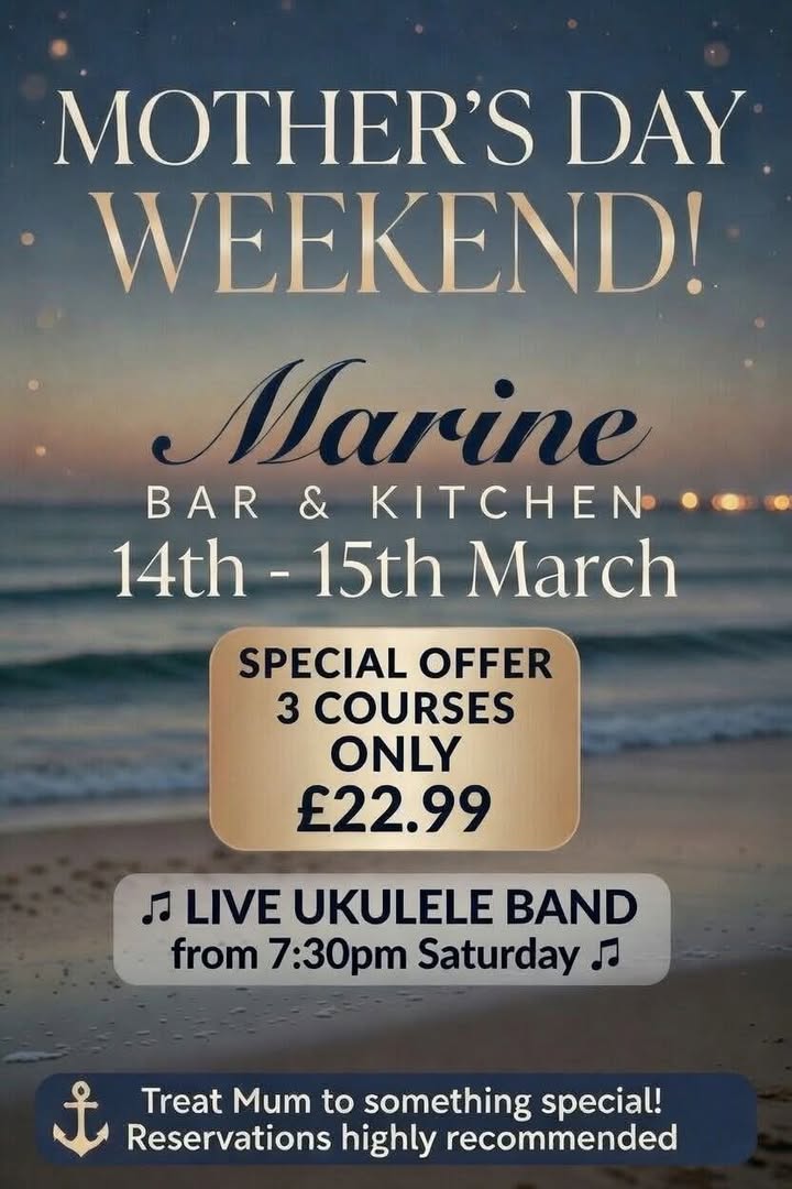 🌸 Mother’s Day Weekend – 14th & 15th March! 🌸 Treat Mum to something special this Mother’s Day weekend — enjoy a delicious 3-course meal for just £22.99! 💐 🎶 Saturday 14th March Celebrate with great food and live music from a very talented ukulele band from 7:30pm — the perfect way to make memories. Book your table today and make it a weekend to remember! 💕 https://www.themarine.pub/ #MothersDayWeekend #MothersDay2026 #FamilyTime #LiveMusic #UkuleleBand #SundaySports #PremierLeague #FootballFans #Arsenal #Everton #Liverpool #Tottenham #WeekendVibes #GoodFoodGoodTimes