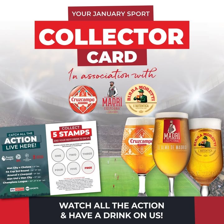 Throughout January buy 5 pints of Cruzcampo, Madri or Moretti and get the 6th free! Pick up your collectors card at the bar and get a stamp for each pint! See you at the bar 🍻🍻