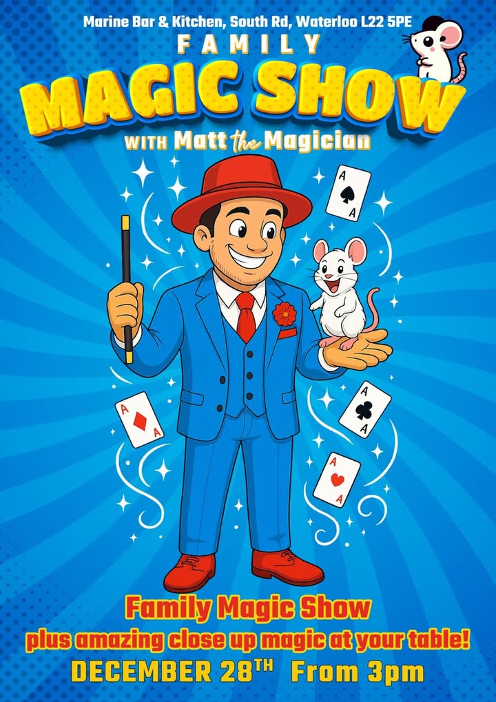 ✨🪄 Family Magic at The Marine Bar & Kitchen! 🪄✨ Join us for an afternoon of wonder and wow moments as magic comes to life at The Marine Bar & Kitchen! 🎩 What’s on: • Close-up table magic to amaze you right at your seat • A fun-filled family magic show everyone will love 📅 Sunday 28th December 🕒 From 3pm Perfect for kids, parents, and anyone who loves a little magic with their food and drinks. Make it a magical Sunday with us! ✨🍽️ 📍 The Marine Bar & Kitchen #FamilyMagic #MagicShow #CloseUpMagic #KidsEntertainment #FamilyFun #SundayFun #WhatToDoWithKids #LiveEntertainment #MarineBarAndKitchen #DecemberEvents #MagicalMoments 🪄✨