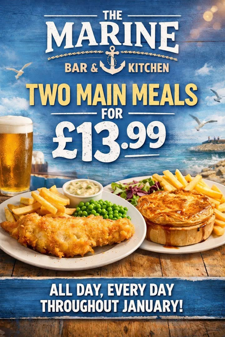 Two for £13.99 🚨🚨 All day, every day! Choose from our delicious favourites: 🍺 Beer battered fish & chips 🥧 Steak & ale pie 🌭 Sausage & mash 🍝 Beef lasagne 🥩 10oz gammon 🍛 Chicken tikka masala 🍔 Classic burger 🦐 Wholetail breaded scampi 🍄 Mushroom bourguignon pie 🥦 Vegetable lasagne Perfect for lunch or dinner — bring a friend and enjoy great value, great food! #TwoFor1399 #AllDayEveryDay #GreatValue #PubGrub #ComfortFood #FoodDeals #EatLocal #ClassicDishes #DinnerPlans #LunchDeal #supportlocal #publifeperfected #themarinebarandkitchen #januaryoffers #whatsonliverpool #freshlymade #localpub #GreatFoodGreatDrinks #drinkswithfriends #keepitlocal